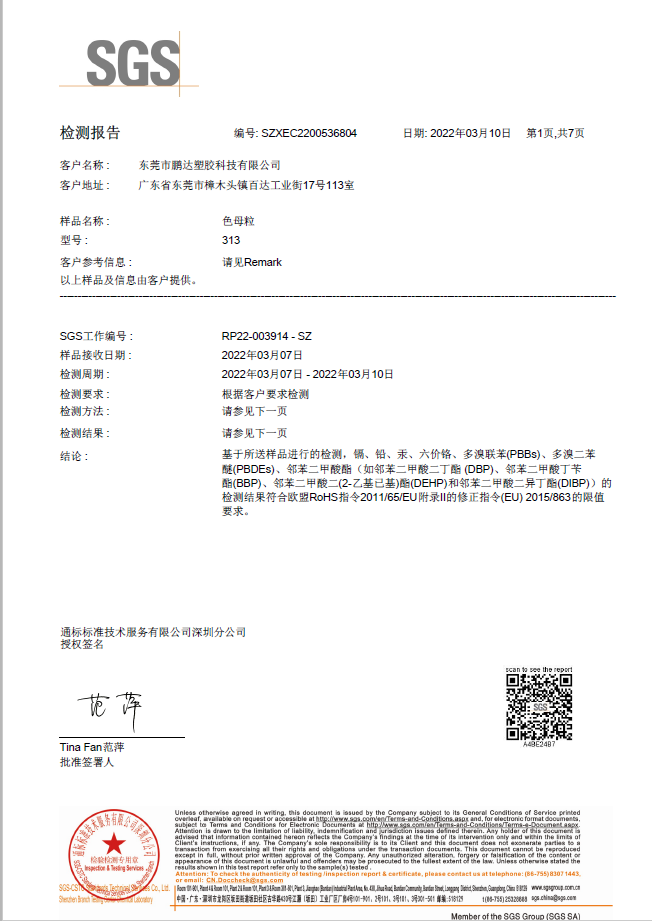 和鵬達塑膠科技有限公司合作很長一段時間了,他們的產(chǎn)品質(zhì)量好,服務(wù)到位,且原材料都通過SGS測試符合歐盟REACH,PaHS、ROHS及無鹵指令,備有美國FDA級食品接觸規(guī)格物料,和他們合作完全沒有后顧之憂!